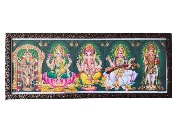 The Balaji, Lakshmi, Ganesha, Saraswathi, Murugan Photo Frame is a stunning and sacred depiction of divine deities, representing wealth, wisdom, prosperity, and protection. This photo frame, adorned with a glitter matt finish, adds a radiant and spiritual touch to your pooja room, altar, or living space. The intricate artwork and elegant design make it an exquisite centerpiece for enhancing your spiritual ambiance.