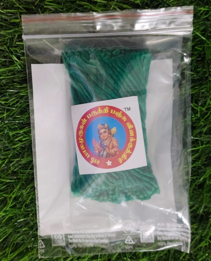 Made from high-quality cotton and natural dyes, this **green thiri** is designed to burn evenly and consistently, ensuring a bright, steady flame that symbolizes the divine energy and protection of Lord Murugan. The green color signifies **growth, prosperity, and auspiciousness**, making this wick perfect for use during occasions like **Skanda Sashti**, **Thaipusam**, and other ceremonies devoted to Lord Murugan.