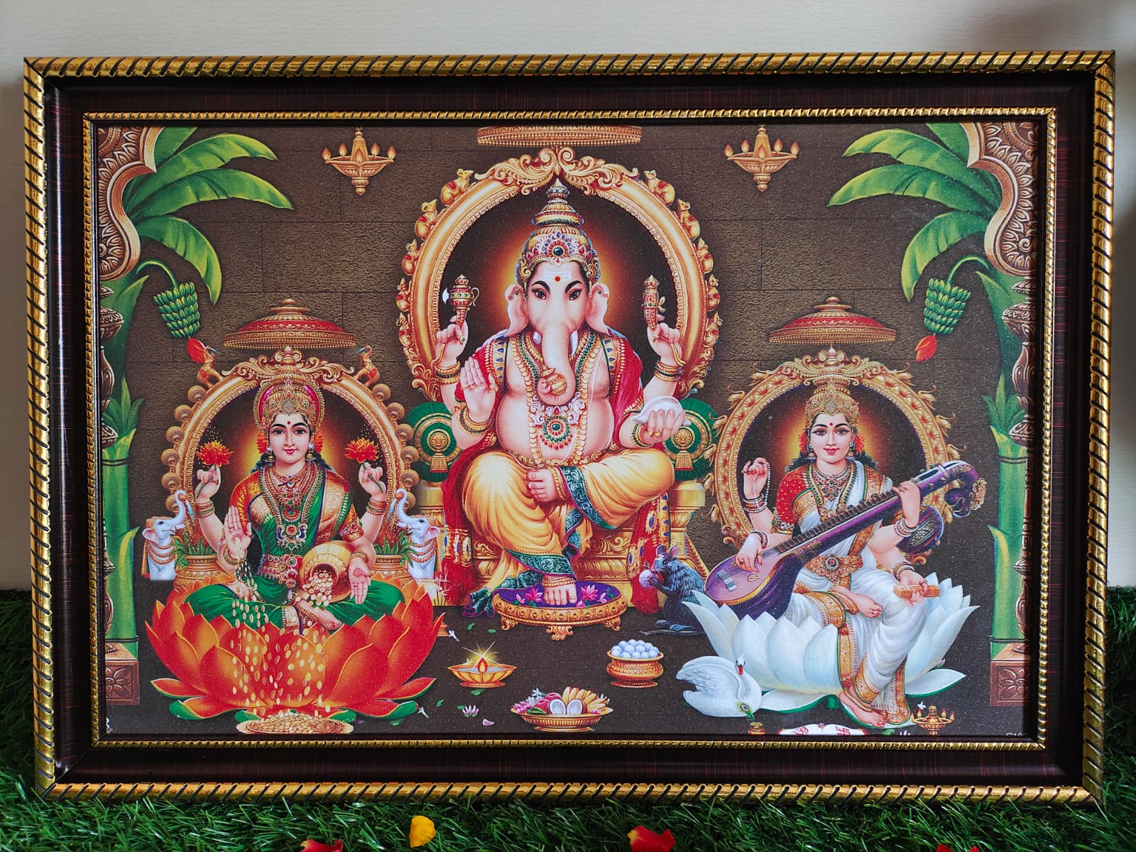 - Divine Trinity: Features Lord Ganesha, Goddess Lakshmi, and Goddess Saraswathi, symbolizing wisdom, prosperity, and auspicious beginnings.