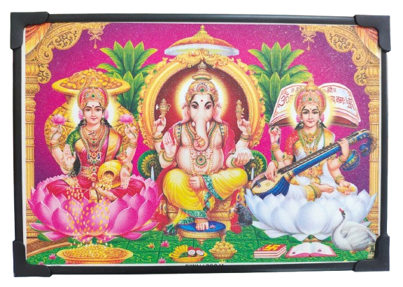 The Ganesha, Lakshmi, and Saraswathi Photo is a divine representation of the trinity of wisdom, wealth, and auspicious beginnings. Featuring Lord Ganesha, the remover of obstacles, Goddess Lakshmi, the bestower of wealth and prosperity, and Goddess Saraswathi, the deity of wisdom and knowledge, this photo is perfect for enhancing the spiritual ambiance of your home or workspace.