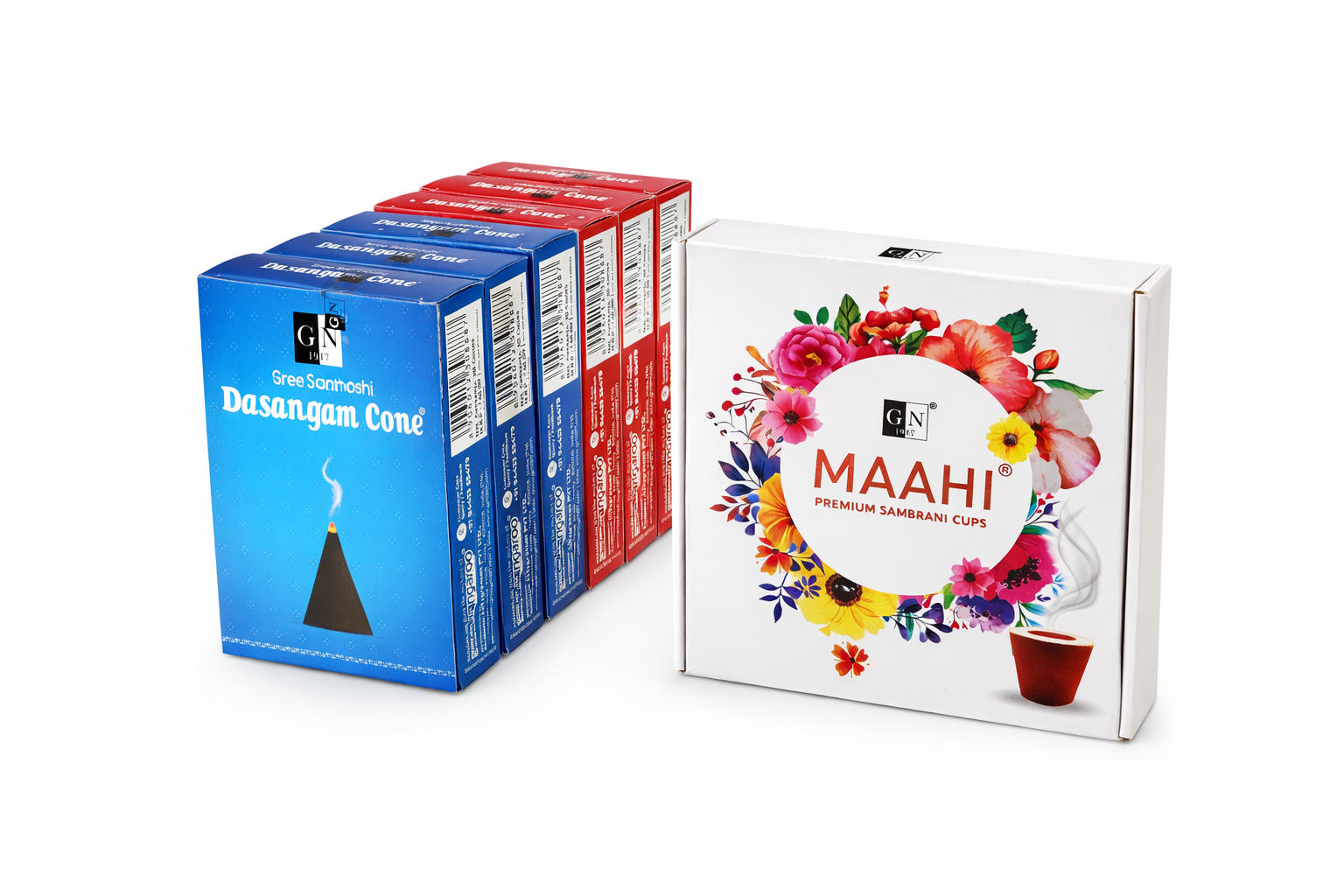 Create a powerful temple-like atmosphere at home with this GN Dasangam Cone Combo, paired with Maahi Javathu Cup Sambrani. This devotional fragrance set includes 6 packets of GN Dasangam cones and 1 Maahi Javathu Cup Sambrani, offering a rich blend of traditional aromas used in temples and sacred rituals.