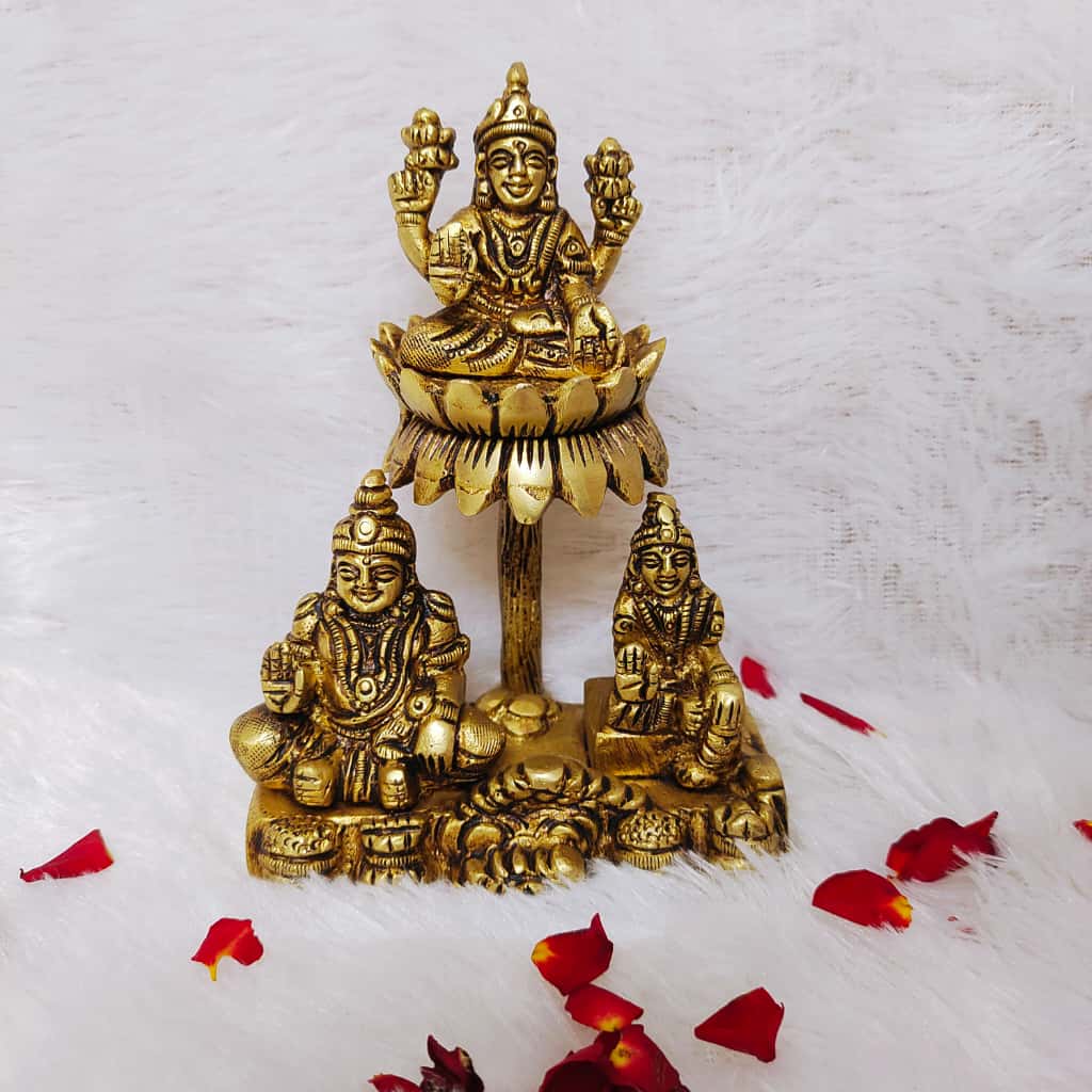 Crafted from pure brass with intricate detailing, this powerful combination of Goddess Lakshmi, the Goddess of Wealth, Lord Kubera, the Guardian of Prosperity, and Radhi Devi, symbolizing auspicious blessings, radiates divine energy and grace.