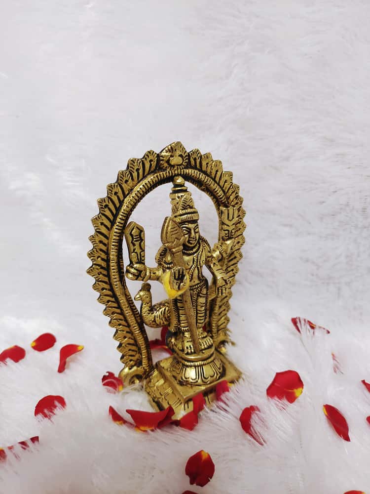 Bring divine blessings into your home with this elegant Lord Murugan Brass Statue with Arch. Standing 5 inches tall and weighing approximately 425 grams, this finely crafted idol depicts Lord Murugan, the God of Wisdom, Valor, and Victory, beneath a beautifully detailed Prabhavali (arch) — symbolizing divine protection and cosmic energy.