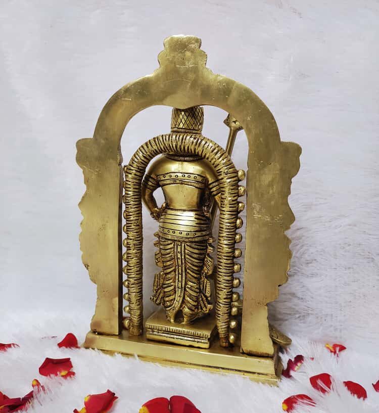 Invoke divine strength, wisdom, and protection with this magnificent Lord Murugan Brass Statue with Arch, a masterpiece of traditional craftsmanship. Standing 8.5 inches tall and weighing approximately 2.3 kilograms, this idol showcases Lord Murugan (Kartikeya/Subramanya) in his regal form beneath a beautifully carved Prabhavali (arch) — symbolizing divine energy and cosmic radiance.