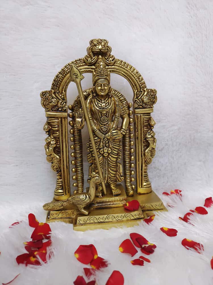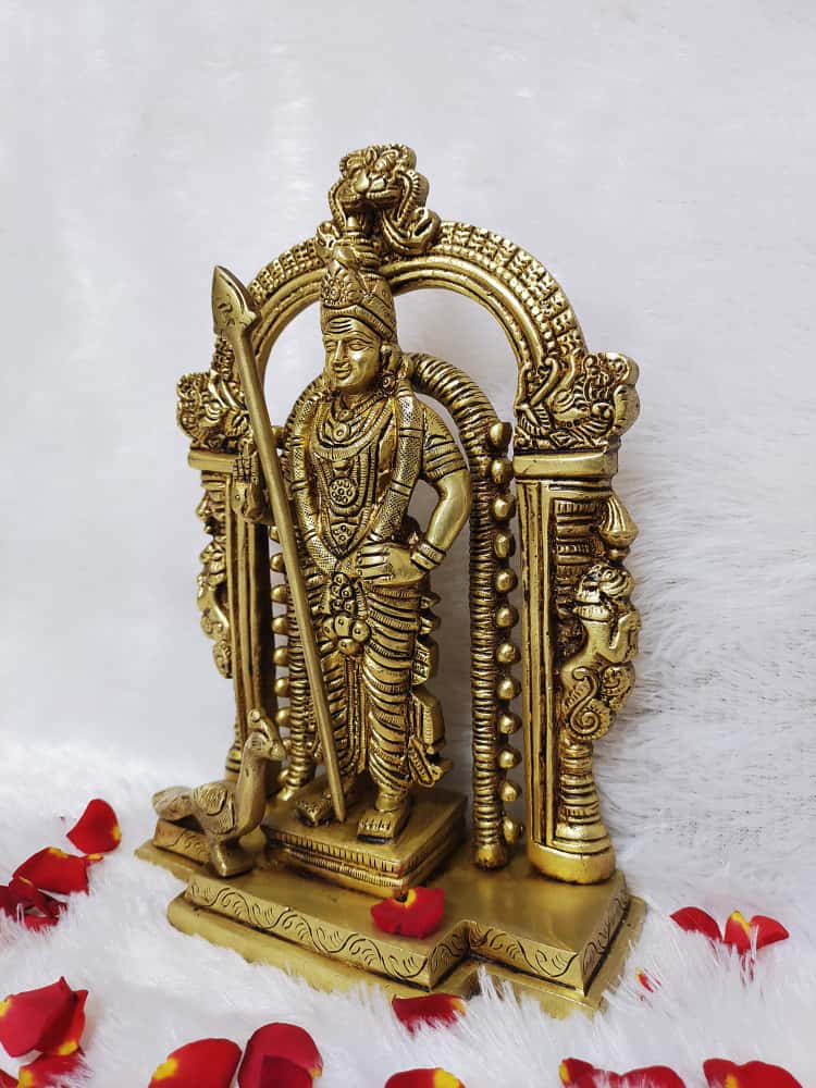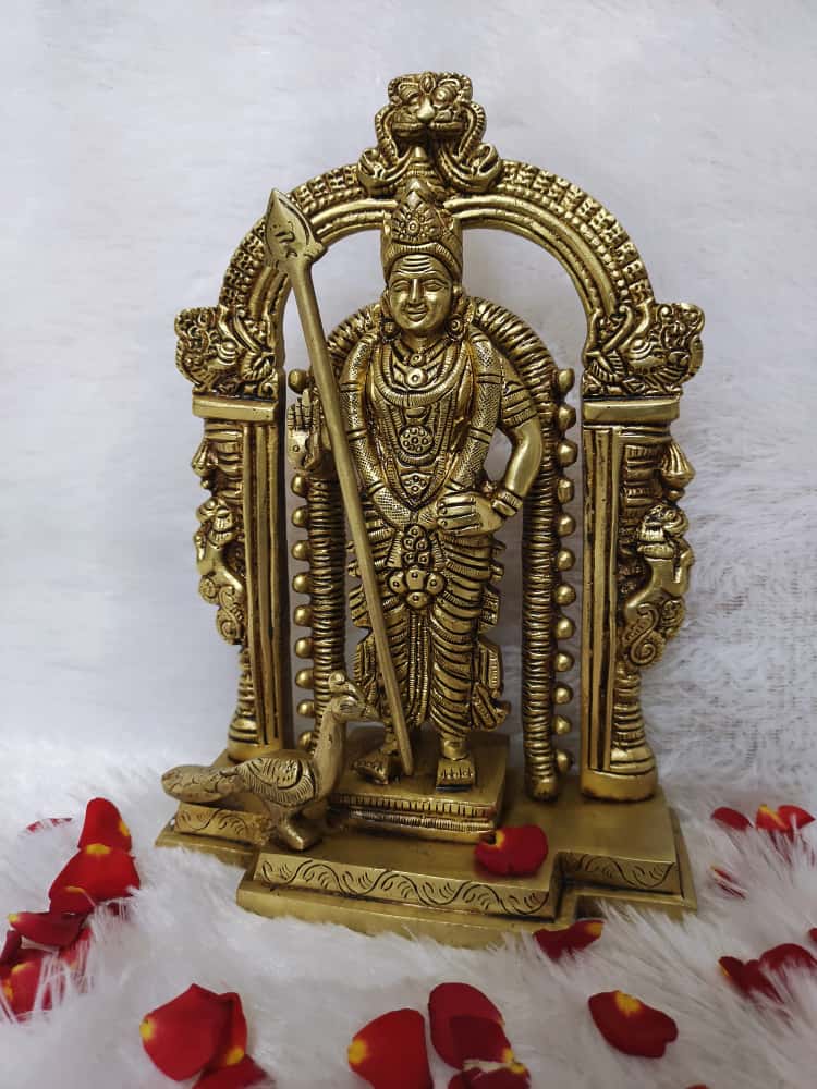 Lord Murugan, the God of Valor, Knowledge, and Victory, is worshipped for guidance, courage, and protection from negativity. Placing this brass Murugan idol with arch at home is believed to invite divine blessings, positivity, and prosperity while elevating the spiritual ambiance of your sacred space.