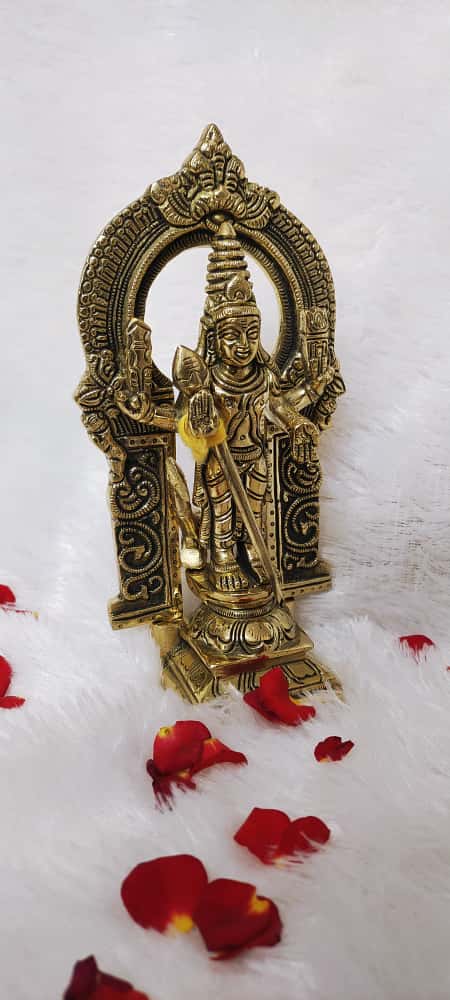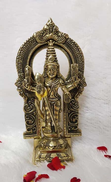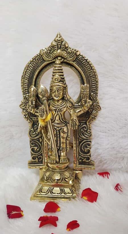 Lord Murugan, also known as Subramanya, Kartikeya, or Skanda, is the God of Valor, Knowledge, and Victory. Keeping his idol at home is believed to remove negativity, bring clarity of thought, and bless devotees with success, peace, and protection. The arch behind the deity represents divine radiance and cosmic energy that surrounds and safeguards the devotee.