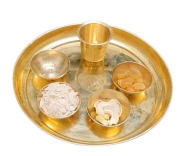 The plate and bowls are perfectly sized for presenting a variety of food items such as sweets, fruits, and other offerings, ensuring that your pooja rituals are conducted with devotion and reverence. The golden hue of the brass adds a divine charm to your pooja room or altar, symbolizing purity and auspiciousness.