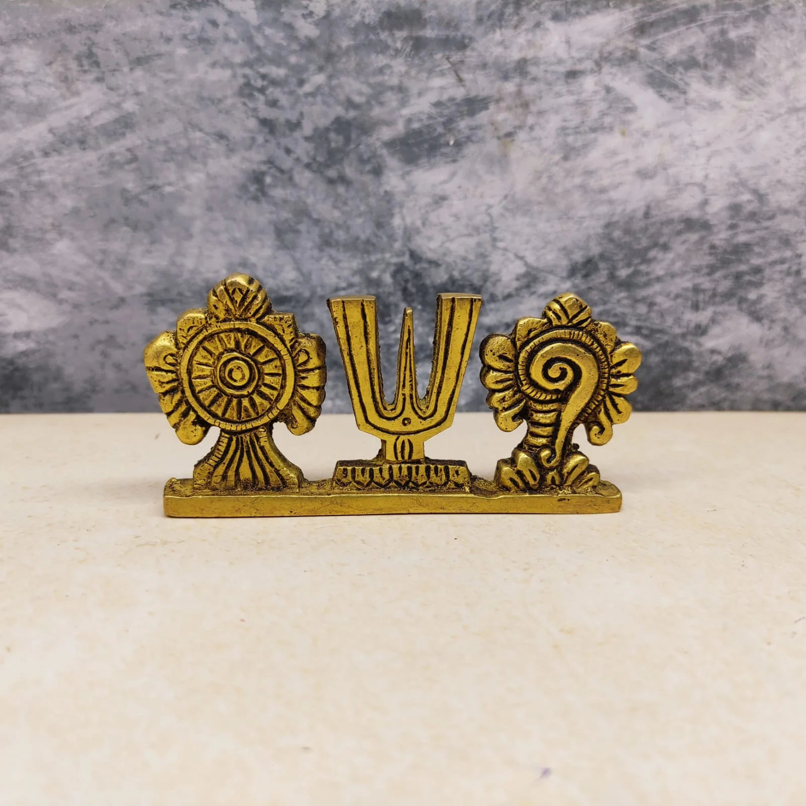 Design: Intricately carved Sangu, Chakra, and Namam mounted together
