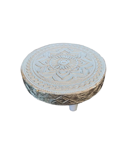 The Wooden Pooja Peedam [Circle] [4.5 Inch] [Silver Cover] is a beautifully designed sacred platform ideal for placing deities, lamps, and pooja essentials. With a sturdy wooden base and a shimmering silver-plated cover, this peedam enhances the spiritual ambiance of your home or temple.